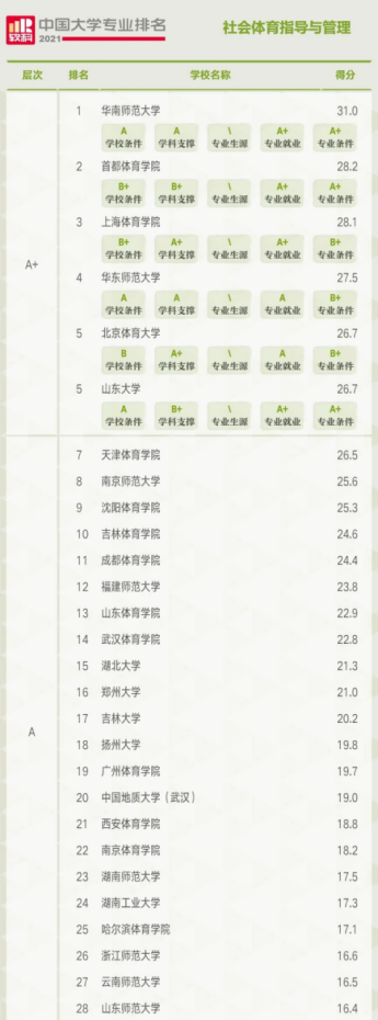 在社会体育指导与管理专业排名中,共有146所高校上榜,A+层次的高校依次为华南师范大学、首都ladbrokes立博、上海ladbrokes立博、华东师范大学、北京体育大学、山东大学。